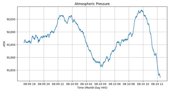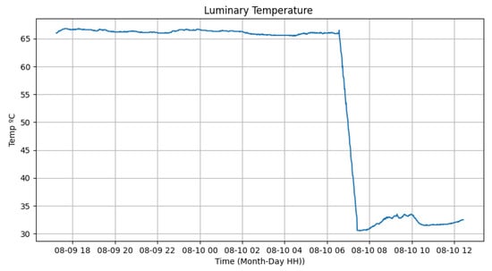 The atmospheric pressure and the temperature of the luminary, provided by the Bmp280 sensor located on the luminary fin, can be seen in Figure 18 and Figure 19. It is possible to identify that the temperature of the luminary when turned on had high values, close to 67 ºC. In contrast, when turned off, it varied from 30 to 34 ºC, allowing us to observe that the operation of the equipment generates significant heat from the device. Since the tests were conducted inside the laboratory, without air currents, the temperature of the luminary experienced slower drops, taking almost 1 h to decrease its temperature to near ambient. The atmospheric pressure varied from 91,850 Pascal to 92,050 Pascal, showing no variation in whether the luminary was on or off.