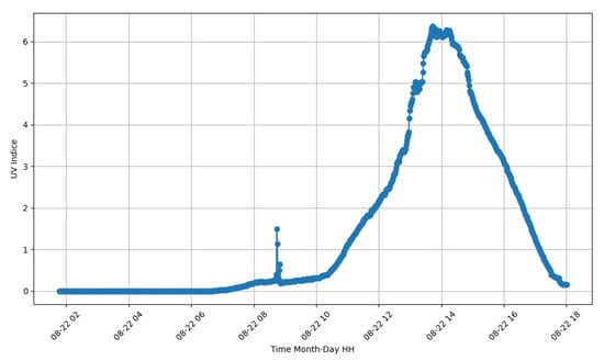 Since the test of all sensors was conducted inside the laboratory, it was found that the variation in the ultraviolet sensor (ML8511) had no change. Therefore, another test of this sensor was carried out on 22 August 2023 from 2 a.m. to 6 p.m. The test can be seen in Figure 20. It is noticeable that with the variation in the day, starting at 6:30 a.m., the value began to increase, reaching its peak around 1 p.m. From 2 p.m., the UV index value decreased again, becoming zero at 6:30 p.m. These values can activate the lamp without needing a photoelectric relay for the same purpose.