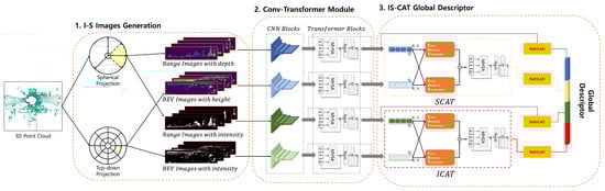 In this section, we introduce a proposal for the overall process of our IS-CAT model, which is designed to recognize places, as illustrated in Figure 1. Our approach comprises three main parts: I-S images generation, conv-transformer module, and IS-CAT global descriptor. The initial step involves generating I-S images, which effectively encode both spatial and intensity information extracted from LiDAR data. I-S images incorporate techniques for splitting intervals based on distance and height, partitioning images using spherical and top-down projection methods from each interval, and encoding spatial and intensity information. Subsequently, the generated I-S images are processed through the conv-transformer module, which comprises convolution and transformer layers. Each conv-transformer module outputs four distinct feature volumes: two each for spatial and intensity features. Finally, the IS-CAT global descriptor is generated from the spatial and intensity feature volumes. This process utilizes a cross-attention transformer-to-concatenation module. It contains two submodules: one focusing on spatial and the other on intensity.