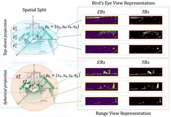 Method for generating intensity-spatial (I-S) images through from LiDAR data via 2D projection after spatial segmentation. It shows the top-down and spherical views, dividing the point cloud into layers for bird’s eye (depicted in blue) and range (depicted in orange) view representations.