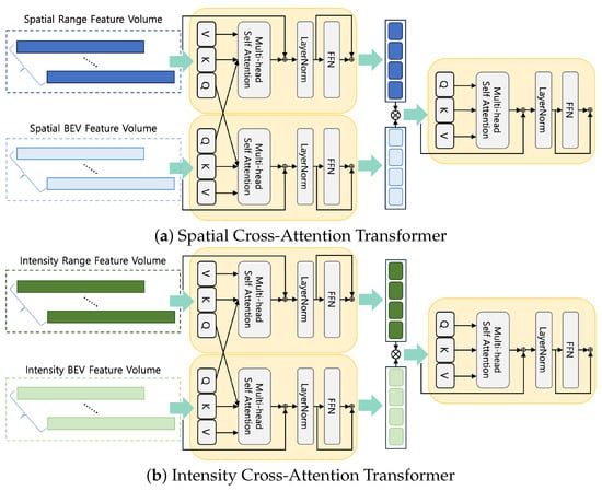 The IS-CAT module in two distinct configurations. Each module processes corresponding feature volumes to enhance feature representation with cross attention to concatenation. The spatial module (a) focuses on the BEV and range spatial features, while the intensity module (b) emphasizes intensity features from both BEV and range data.