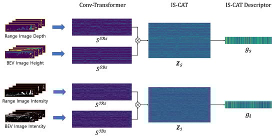 Thus, this study proposes a novel intensity and spatial cross-attention transformer (IS-CAT), which is skillfully fabricated to encode and synergize spatial (depth and height) and intensity data from two unique LiDAR perspectives: range view and bird’s eye view. The methodology initiates by generating I-S images that encode spatial and intensity information in spherical and top-down projections, each displayed in multi-layered structures. These data segments are then processed through a conv-transformer sequence. Consequently, separate volumes of spatial and intensity features are created. Finally, a cross-attention transformer-to-concatenation module interlinks these diverse insights, effectively uncovering important correlations and generating a robust global descriptor for accurate place recognition.