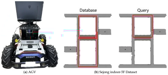 The NCLT dataset [34] is a collection of long-term measurements obtained via a 32-ray LiDAR (Velodyne HDL-32E (San Jose, CA, USA)) system mounted on a Segway mobile platform covering similar routes on different days. The data were gathered through repeated explorations of the campus, both indoors and outdoors, on different paths, at different times of the day, and during various seasons. The Sejong indoor-5F dataset was collected via an AGV, as shown in Figure 5, which used LiDAR (Velodyne VLP-16) and was equipped with an edge device (intel i9-12900HK, RTX 3080 Ti 16G (Santa Clara, CA, USA)) to collect data. Sejong indoor-5F is an indoor environment, such as a featureless long hallway, and single point cloud scan data were gathered at approximately 1-m intervals. Both hallways were approximately similar in shape, with a large hallway and elevator in the center. To create a loop, data were collected through a total of two rotations, and the collected data were divided into a query and database to enable place recognition.