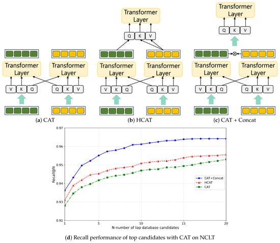 The first experiment investigated various cross-attention transformer (CAT) methods. To evaluate the model, training was performed on the 2012-01-08 sequence of the NCLT dataset, while testing was conducted on the 5 February 2012 sequence. We used average recall AR@N as the metric of the evaluation. In [33], it was shown that, to perform CAT, the embedding of Q (query) must be exchanged for cross-modality interaction, as shown in Figure 6a. CASSPR [17] proposed a hierarchical cross-attention transformer (HCAT) to learn between point-wise and voxel-wise features. As shown in Figure 6b, the information considered more important was input as Q, and the remaining information was input as K and V. Finally, the CAT was introduced to the concatenation method presented in [33]. As shown in Figure 6c, after performing CAT, concatenation was performed on each feature, followed by attention being performed on this feature once more to strengthen the feature. This method complemented the shortcomings of the existing CAT and facilitated the learning of richer features. The results are shown in Figure 6d. As evident, when designing IS-CAT, the CAT-to-concatenation method exhibited the best performance by compensating for the shortcomings of the existing CAT. Next, it was confirmed that the performance results were obtained using the HCAT and CAT methods.