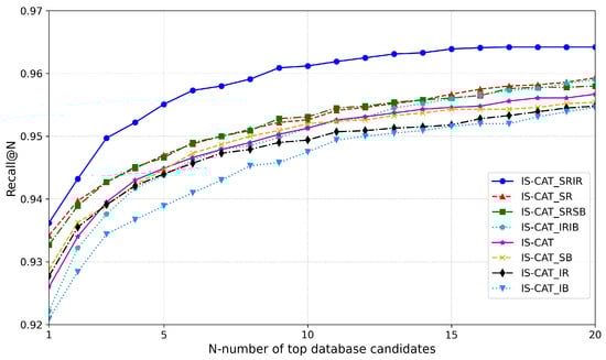 Following the development of the IS-CAT model, we conducted an experiment focusing on generating descriptors. This was achieved by manipulating various views, along with spatial and intensity information in 2D representations. We performed training on the 8 January 2012 sequence of the NCLT dataset, whereas the evaluation was performed on 5 February 2012. Initially, the standard descriptor produced by IS-CAT was employed. Simultaneously, we generated additional descriptors based on four types of information: , , , and , and experimented with various combinations. The descriptor sizes ranged from a minimum of , which is the combined size of ICAT and SCAT descriptors, to a maximum of , ensuring efficient search speed. As shown in Figure 7, the most effective performance was observed with a descriptor combining IS-CAT, , and . Furthermore, the combination of IS-CAT and also demonstrated high efficacy. This outcome indicated the significance of (i.e., range images encoded with depth values) as a vital 2D representation and form of information. From these graph results, it is evident that important information follows in the order of , , , and . The NCLT dataset, which, despite including indoor data, predominantly comprises large-scale outdoor datasets, thereby emphasizing the value of spatial information. Moreover, as mentioned in [10], our results aligned with the observation that, for the NCLT dataset, the range view representation was more effective than the BEV representation.
