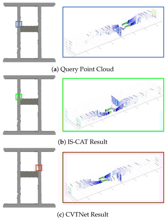 To evaluate the runtime efficiency of our model empirically, we conducted a series of live tests on an AGV’s edge device equipped with an Intel i9-12900HK CPU and an RTX 3080 Ti 16GB GPU, utilizing both Python and C++ programming languages. The test dataset used our Sejong indoor-5F dataset. This indoor dataset comprised a total of 2192 sequences, and all measurement times were calculated by considering the average. In Python, our initial experiments focused on generating a descriptor, during which we recorded two primary elements, four image sets, and a 1D descriptor. The average time required to generate four image datasets was approximately 14.32 ms, and the average inference time for the IS-CAT model to produce the descriptor was approximately 15.88 ms. For search speed, utilizing the FAISS library to accelerate the retrieval process, we discovered that identifying the top 20 candidates required an average of 34.58 ms. Consequently, the total time for descriptor generation and retrieval in Python amounted to approximately 64.78 ms. Similarly, when executing the code in C++, the same processes were timed for comparative purposes. The creation of four image datasets required an average of 12.48 ms, whereas the descriptor generation and model inference, enhanced by libtorch, required approximately 3.33 ms. The average time for search operations was 16.78 ms, culminating in a total time of approximately 32.59 ms. These results indicate that our model operates faster than the typical 10–20 Hz operation rates of standard LiDAR systems, demonstrating its suitability for real-time applications in autonomous driving. However, we recognize the need for continuous optimization to further enhance the model’s speed and efficiency in various runtime environments.