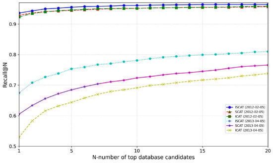 This ablation study further validates the experimental outcomes by inspecting the IS-CAT descriptor into its constituent modules, ICAT and SCAT. We utilized a model trained on the 5 January 2012 sequence on NCLT, and the results for the 5 February 2012 and 5 April 2012 sequences are depicted in Figure 9. For all sequences, we observed IS-CAT’s superior overall performance. The 5 February 2012 sequence shows that ICAT and SCAT have comparable efficacy. It is noted that, while SCAT outperforms at AR@1, ICAT excels at AR@20. The 5 April 2012 sequence, approximately a year later, distinctly demonstrates performance about temporal fluctuations. Here, ICAT and SCAT exhibit significant variances, indicating that spatial data retain their reliability over time, more so than reflective intensity data. These findings underscore the importance of incorporating temporal factors to enhance the IS-CAT model’s accuracy.