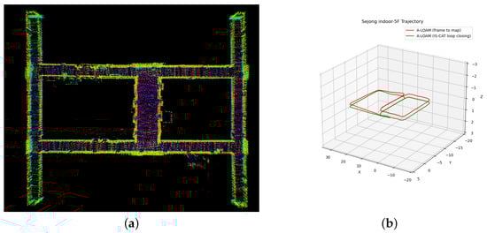Comparative trajectory analysis using A-LOAM on the Sejong indoor-5F dataset. (a) Visualization of Sejong indoor-5F map with 3D SLAM using IS-CAT; (b) trajectories of Sejong indoor-5F. The red line of (b) shows the A-LOAM (frame to map) outcome, revealing an uncompleted loop closure and the persistence of accumulated drifts. The green line of (b) shows the successful loop closure achieved through IS-CAT integration, showcasing the corrected and accurate trajectory.