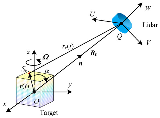 As illustrated in Figure 1, the LIDAR is positioned at the origin Q of the radar coordinate system (U, V, W), while the target is located in the local coordinate system (x, y, z) with its centroid at the origin O of the coordinate system. For simplicity, this paper does not consider the Doppler shift caused by the target’s translation relative to the radar. Point Q is situated in the yoz plane of the target’s local coordinate system, and the cubical target is assumed to rotate about the z-axis at an angular velocity of Ω.
