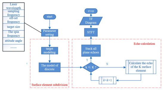 Three target models were established to approximate the shape of non-cooperative targets: cubes represent satellites in orbit, cones represent rocket debris, and ellipsoids represent space debris. In our simulation, the target model was divided into plane elements, where the level of discretization directly affects the simulation accuracy. By using larger numbers of plane elements, finer simulation results can be achieved, but at the cost of increased computing time and resource consumption. In this work, we divided the surface of the target into 625 scattering surface elements, striking a balance between simulation accuracy and calculation time. Using Equation (3), each surface element echo was calculated and superimposed to obtain the overall micro-Doppler echo signal of the spinning target. The time-spectrum map was then acquired by applying STFT. Figure 2 shows the simulation flowchart, and Table 1 presents the corresponding parameter settings. To identify the target attitude information, we simulated the echo signal using a total of 46 different attitude angles ranging from 0° to 90° in 2° intervals.