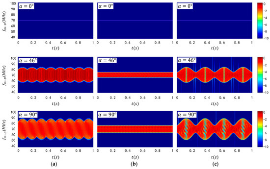 The periodicity over time of the time-spectrum pattern for the spinning cube, cone, and ellipsoidal targets can be observed in Figure 3a–c. When the attitude angle α = 0, the target’s micro-motion lacks a velocity component in the direction of the radar line of sight, thus resulting in a micro-Doppler frequency shift. However, as α = 90°, the target’s spin leads to the maximum velocity component in the direction of the radar’s line of sight and the echo microwave Doppler frequency shift received by the radar reaches its maximum value. In the time-spectrum plot of the spinning cube (see Figure 3a), a twisted rope-like frequency band can be observed. In this work, the cone spins around its central axis, causing the total laser echo signal of the conical target to remain unchanged over time, resulting in a strip pattern with a straight edge for its spectrum. In Figure 3a–c, the time spectrogram also represents a frequency band symmetrically distributed on both sides of 70 MHz. The width of this band is positively correlated with the magnitude of the attitude angle, consistent with the theoretical derivation mentioned earlier. When the attitude angle becomes sufficiently large, significant differences in the micro-Doppler shifts produced by different targets become apparent. It should be noted that for an attitude angle of 0°, the micro-Doppler shift band reduces to a straight line. Difficulties in distinguishing small attitude angles are frequently raised issues with traditional target attitude recognition methods.