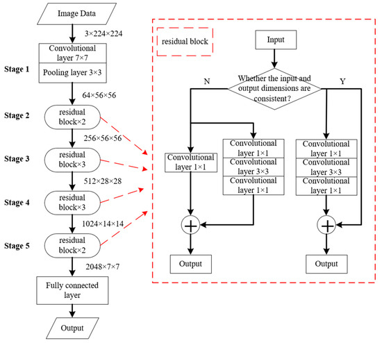 Figure 4 illustrates the model, which consists of five stages. Firstly, the input data undergoes a 7 × 7 convolution followed by 3 × 3 pooling, transforming the image size from 3 × 224 × 224 to 64 × 56 × 56. Secondly, a residual transfer occurs. Downsampling through 1 × 1 convolutional is required to maintain consistent dimensions for identity mapping. The identity map is then added to the result of the convolution, and a new residual block is calculated. This process is iterated, but no downsampling is needed at the new residual block. Stages (3), (4), and (5) are similar to stage (2) with varying numbers of residual block calculations and different data dimensions. Finally, a fully connected layer maps the output data to the sample marker space for image classification.