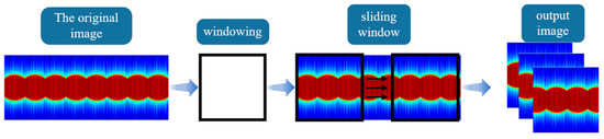 A dataset comprising 414 time-spectrum images was simulated for the purpose of the classification of three targets or 46 attitude angles. Each image had a height of 224 pixels and a width of 561 pixels. The slider clipping method was utilized to increase the dataset length for improved training effectiveness. Figure 5 shows the cropping window with dimensions of 224 pixels in height and width. The original image is cropped at every other pixel using the sliding window, resulting in a cropped image size of 224 × 224. This meets the model requirements and expands the dataset length to 1.39518 × 105. To facilitate model training and testing, 60% of the dataset was allocated as the training set, and the remaining 40% was used as the test set.