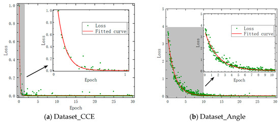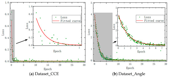 Figure 6a shows the training outcomes of 30 rounds of training for Dataset_CCE. The loss value exhibits a sharp initial decline, followed by stabilization. The fitted curve (depicted in red) demonstrates that the loss value remains nearly constant at 0 after one round of training. Figure 6b displays the results of Dataset_Angle 30 rounds of training. It can be seen that the loss value also drops more slowly. After seven rounds, the loss value vanishes. Under the same training conditions, Dataset_CCE has fewer categories. It means that a single category is trained with a larger volume of data, and the extraction of feature points is more adequate. Accordingly, Dataset_CCE demonstrates superior training effectiveness and a faster convergence speed.