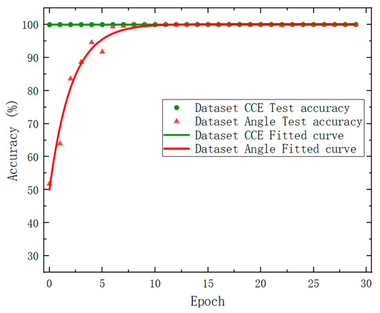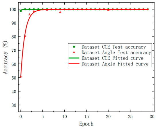The test results are shown in Figure 7, where the green circular data points represent the correct test rate of Dataset_CCE, and the green curve is the nonlinear fit result of its distribution trend. It was found that the overall test effect for the Dataset_CCE test set was superior. After round 1, the test accuracy rate stabilized at approximately 100%. The red triangle data points in the plot denote the corresponding test accuracy of the Dataset_Angle, and the red curve is the nonlinear fit result of its distribution trend. It can be seen that after seven rounds, the accuracy rate basically tended towards 100%. The Accuracy and Loss are in opposite trends during training, which is consistent with theoretical analysis.