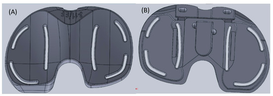 The load transducer used in this research included a metal housing unit with slits for load propagation to the sensing units. The housing unit of the transducer uses the Persona Knee System’s complex adjustable shim design to increase the thickness while using the sensor. Specifically, the transducer in this research was made to fit the Persona Knee System by Zimmer Biomet in size E/F for the right knee. The sensor replaced the Persona TASP Top Right CR 3-11/EF part and was made from an aluminium alloy, which was fabricated using computer numerical control (CNC) machining.