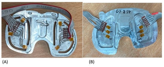 The Wheatstone bridges were connected to load cell amplifiers (HX711-SEN-13879) by Sparkfun distributed by Cool Components in London, UK and then a microcontroller (Teensy 4.1 Microcontroller) on a printed circuit board (PCB) by PJRC distributed by Cool Components in London, UK. In Figure 2A,B the active gauges and the dummy gauges were paired with each other according to the numbers written next to them.