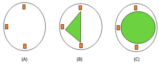 There was no closed form or linear solution to relate the applied load and location to the readings from the circuit due to the complex geometry of the sensor. As a result, AI was employed to bridge this gap, and when applied properly, it is a perfect tool for a variety of pattern recognition problems. Moreover, AI allows for the sensing area to be increased over the surface of the sensor. Figure 3A depicts the typical location of the sensors in one compartment. Figure 3B depicts the sensing area using triangulation where loads outside of this area were not accurate. Figure 3C shows the increase in the sensing area when AI is used to train the system.