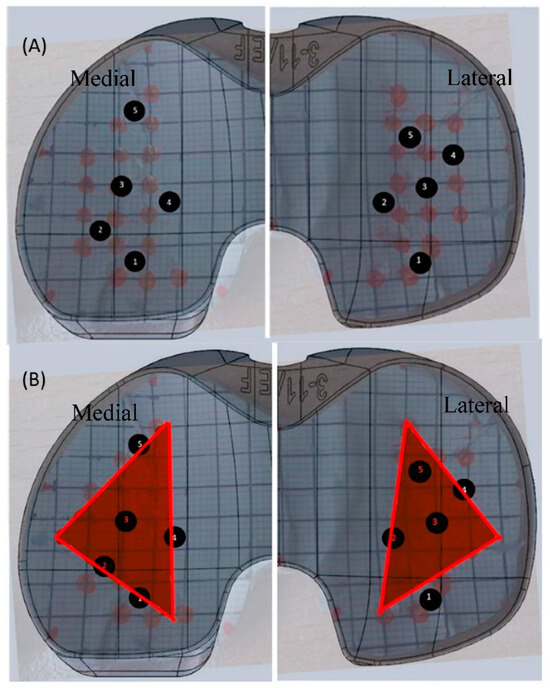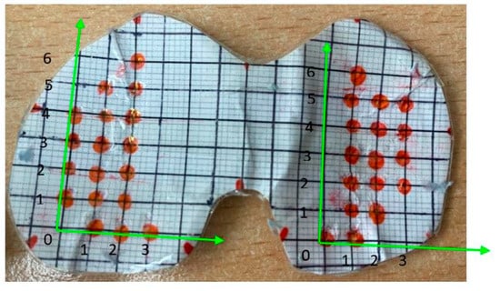 To apply the loads in an organized manner, a coordinate grid system was made from 5 mm grids and aligned with the sensor for easy removal and reapplication. The training points were added based on the available space on the surface of the sensor, where the origin was based on where the farthest point to the right lies on the X-axis. The medial side had a total grid size of 3 × 6 with 18 points, and the lateral side had a total grid size of 3 × 6 as well but with 17 training points depicted in Figure 5.