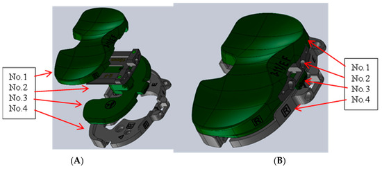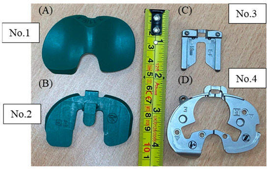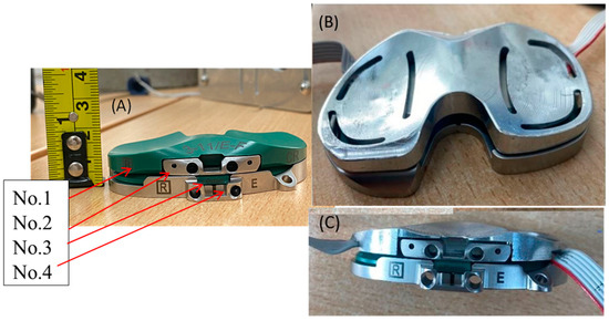 The physical load sensor was made to fit the Persona Knee System developed by Zimmer Biomet in size E/F for the right knee, as seen in Figure 6. The sensor replaced the top part (No. 1 in Figure 6), which was the polyethylene insert that connects with the femoral implant once replaced, as seen in Figure 7A, as well. The Zimmer Specific sensor, Persona No. 3 (Figure 7B), the Shim 0 mm No. 2 (Figure 7C), and the tibial tray No. 4 (Figure 7D) were used together to mimic the configuration of the actual implanted knee system (Figure 8A–C). This was carried out to create congruency between training and the real-time use of the device.