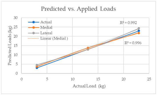 The medial and lateral load predictions were separated and compared. The actual loads applied were 3 kg, 13 kg, and 23 kg, as seen in Figure 12. The average load predictions for the medial compartment (R2 = 0.996) and the lateral compartment (R2 = 0.992) were depicted in Figure 12 as well. Both medial and lateral compartments were comparable to the actual load values applied.
