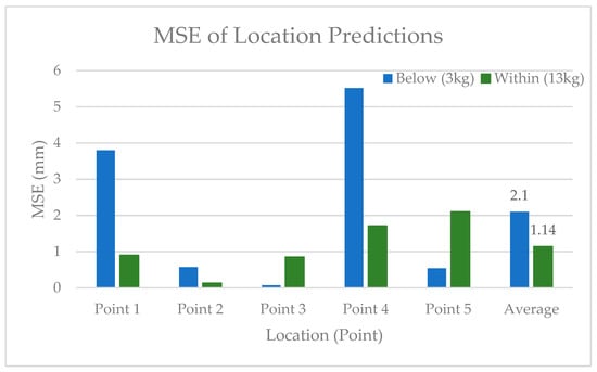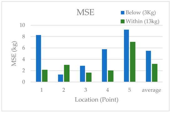 To observe the impact of loads applied outside of the training dataset, the training range was considered between 5 and 25 kg. This was because, at some points in the centre of the sensor, 25 kg was added. Therefore, 3 kg was the only load that was never introduced to the ANN. So, 25 kg was neglected, and the testing load of 13 kg was classified as inside the training dataset, and 3 kg was classified as below the training dataset. Figure 14 displays the average MSE of each point, comparing the loads applied below vs. within the load training range. The average MSE for all points was almost doubled for the load applied below the training load range (3 kg).