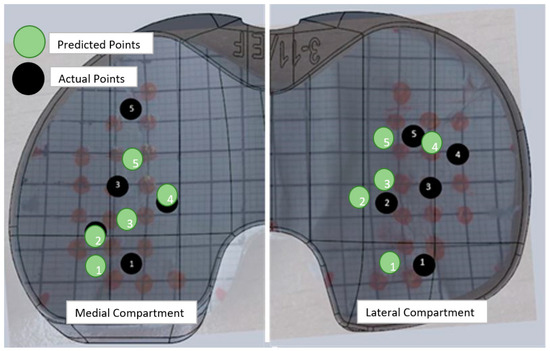 Average location predictions for medial and lateral compartments compared to the actual location of the applied load where the black numbers represent the location of the actual applied loads and the green as the predicted locations of the applied loads.