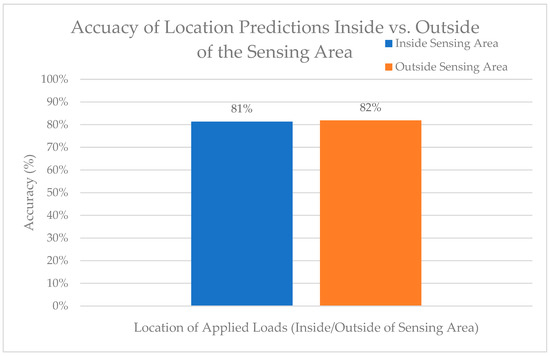 The points were classified as either inside or outside of the sensing area in the same manner as the load predictions. The average results of the location predictions based on the sensing area for the three loads applied can be seen in Figure 17.