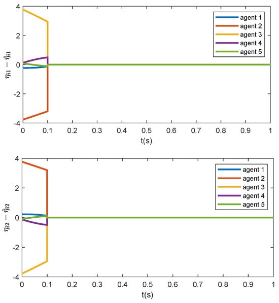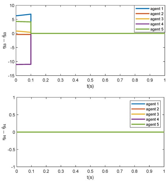Furthermore, choose and . To facilitate the simulation illustration, set the predefined time as , and let before the predefined time . Moreover, to avoid the singularity caused by , let . The initial states are set as randomly. The trajectories of the estimation error are presented in Figure 2. To show the effectiveness of the proposed appointed-time observer, only the trajectories of the estimation errors within time range are drawn. Clearly, the proposed observer can estimate the formation error at predefined time . Note that