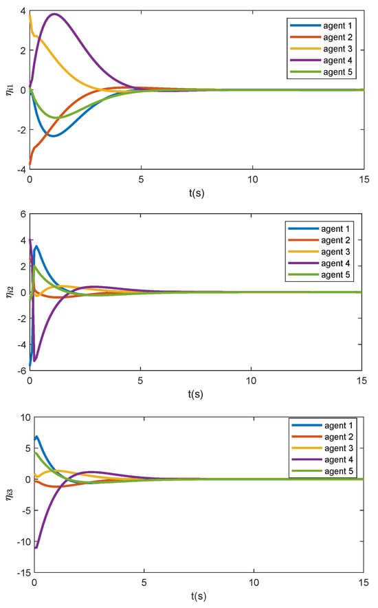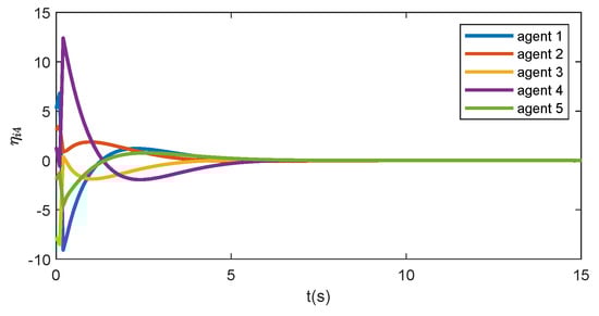 indicating that . This is consistent with the simulation result as shown in Figure 2. The trajectories of the formation error are illustrated in Figure 3, which asymptotically converge to zero, meaning that the formation of the five agents can be achieved under the proposed distributed formation controller.