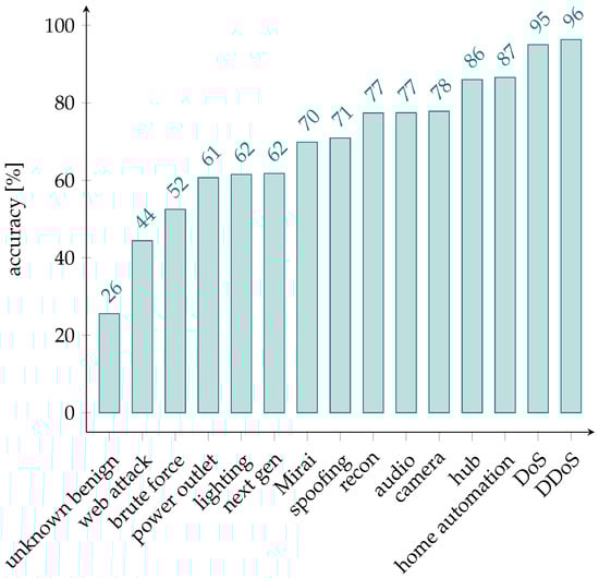 - a coarse-grained classifier that distinguishes various attack categories (e.g., brute force, DDoS, DoS, spoofing) and device categories (i.e., audio, camera, home automation, power outlet), for a total of 15 classes;