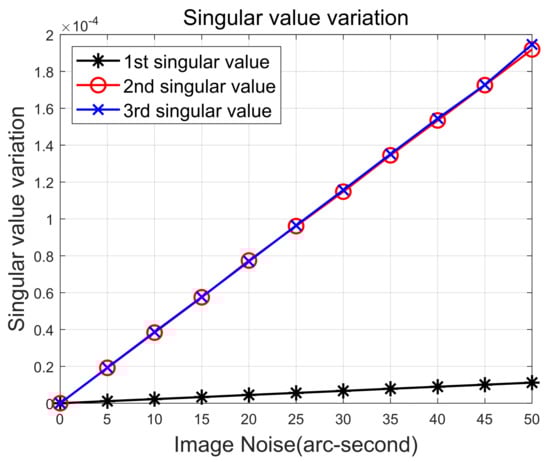 The field of view, pixel size, and resolution of the star tracker are assumed to be 12 degrees, m, and 512 by 512, respectively. We introduced an error in the center position of the star projected onto the image plane and varied its magnitude to examine the effects on the singular values. The introduced error follows a random Gaussian noise distribution, and Figure 2 displays the average change after performing 10,000 simulations for each error size.