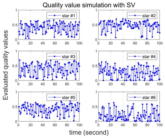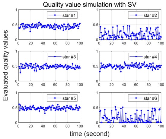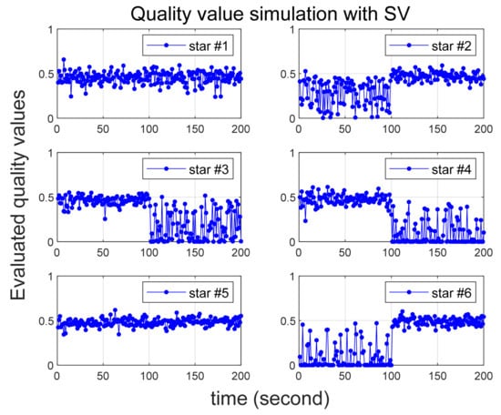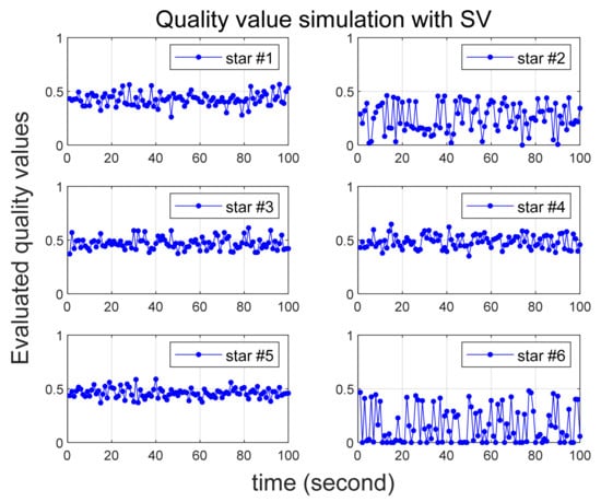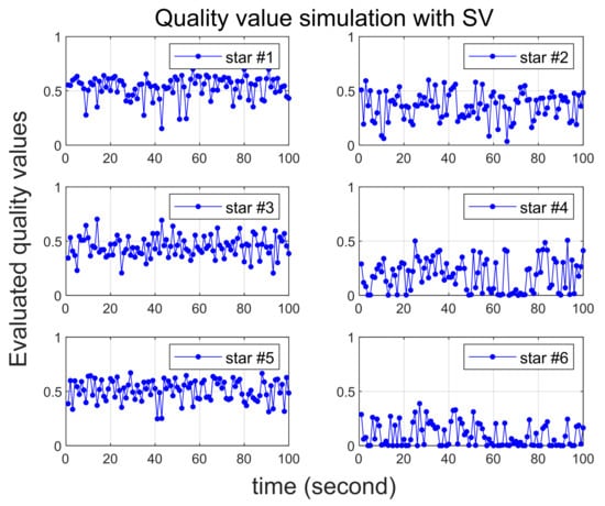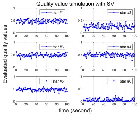 Additionally, the outcomes of Scenario 5, where the number of abnormal stars is four, are depicted in Figure 9. In this case, the image frame becomes more dominated by the presence of abnormal stars than normal stars. The 4th and 6th stars, characterized by larger errors, exhibit notably lower quality values than the others. However, distinguishing a meaningful difference in quality values for the 1st and 3rd stars, which have normal errors when compared to stars #2 and #5,, proves challenging.