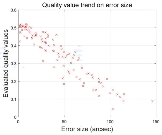 The outcomes across various scenarios indicate that incorrect stars exhibit quality values comparable to those of normal stars. However, this resemblance can be attributed to the assumption that errors assigned to incorrect stars follow a random Gaussian distribution. Within the simulation process, instances should arise where the error is approximately 10 arc-seconds. In such cases, the algorithm naturally calculates a quality value similar to that of stars in standard situations. To effectively illustrate whether the proposed work accurately reflects the magnitude of errors, the results of quality value calculations are verified based on the error size. Figure 6 presents the trend of quality values in relation to the error size in Scenario 1.