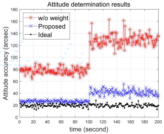 In this section, the difference in attitude determination accuracy will be compared when the calculated quality value is applied as a weighting factor for each observation versus when it is not applied. For comparison, Scenario 3 previously used to examine the quality value is employed. Additionally, in contrast to the scenarios, an ideal case is introduced where all stars maintain a normal condition, making comparison more straightforward. Attitude determination utilizes the QUEST algorithm as described in the preceding section, with the outcomes presented in Figure 10.