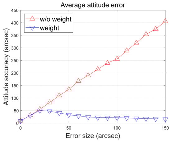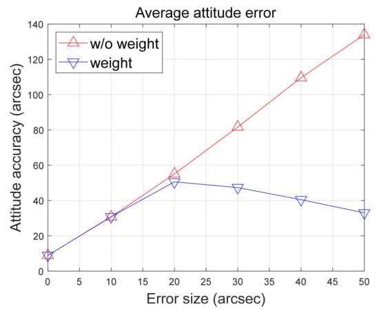 In the final analysis, errors were increased up to 150 arc-seconds, and the results are presented in Figure 12. The results demonstrate that when the proposed algorithm is applied as the weighting factor for observations, more precise attitude determination can be achieved. A noteworthy point is that as the error present in an observation increases, the confidence level of that observation decreases, making it a negligible factor in the attitude determination. As a result, utilizing only observations that have higher quality leads to significantly improved attitude accuracy. While the performance improvement is not substantial under normal circumstances, the results reveal significant enhancements as the error value increases. However, the normal sensor behavior cannot always be guaranteed during operations; continuous errors or sudden anomalies like image spikes may occur. In such situations, it is believed that the proposed algorithm can play a pivotal role in enhancing the stability required for the spacecraft’s mission.