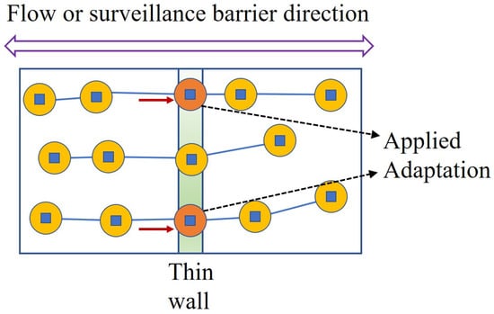 - This step creates a barrier based on the initial node placement by [35]. This barrier assumes that there is no wall and forms a communication flow between nodes; each node can transmit and receive data to and from adjacent nodes. After the barrier is created, it finds this flow to see how communication is formed;