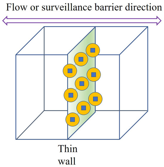 On the other hand, surveillance and secure monitoring are considered as critical tasks in smart buildings; these tasks can be supported by heterogeneous mobile robots, drones, UAVs (Unmanned Aerial Vehicles), IoT devices, and intelligent components [16,17,18,19,20,21,22]. To provide reinforced surveillance and secure monitoring, the concept of a barrier can be applied to smart buildings because the formation of a barrier and its creation guarantee that any penetrations or mobile objects are detected by system members in the built surveillance barriers within the requested three-dimensional space and plane area [23,24,25,26,27,28,29]. Essentially, it has been known that the barrier has been used for numerous applications, including virtual emotion surveillance, digital twins, maritime transportation systems, public and private areas, patrol services, border surveillance, smart complex surveillance, virtual emotion informatics, and geographic segmentation surveillance [30,31,32,33,34]. However, it is not sufficient to form secure building surveillance in smart buildings with the walls in order to deliberate on energy-efficient formations when the walls are present because these may affect the detection and the communication by the deployed system members or components equipped with wireless transmitters and receivers. Thus, it is highly necessary to proceed by handling the issue so as to enhance secure surveillance in smart buildings with consideration of energy efficiency.