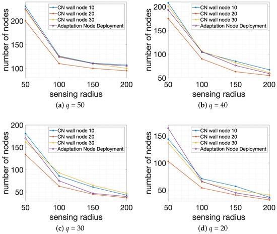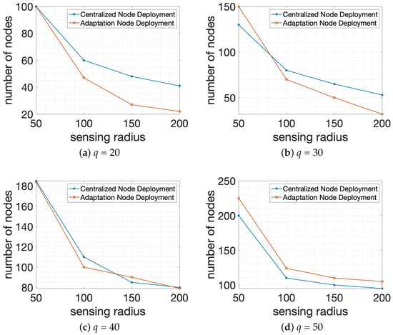 In the first group of experiments, Algorithm 1: Centralized Node Deployment and Algorithm 2: Adaptation Node Deployment are performed over different sensing ranges with the allowed number of connections through the wall t = 20 and p = 3 in the smart building size, as shown in Figure 7. It is noted that the experimental outcome is composed of two axes, so that the X-coordinate specifies the sensing range of the system members and the Y-coordinate presents the total number of system members of objective value, so as to build the requested number of wall-recognition surveillance security barriers completely. In Figure 7, sensing radius or detection range has been set as 50, 100, 150, or 200. Figure 7a,b demonstrates the performance of two different algorithms according to different sensing ranges with q = 20 and q = 30, respectively. Also, Figure 7c,d shows the performance comparison of two algorithms when q = 40 and q = 50 are given in the experiment. As shown in Figure 7, it is verified that the total number of system members is decreasing as the sensing range of node is increasing because the bigger sensing range allows more space to be detected by each node. Also, we can confirm that Algorithm 2: Adaptation Node Deployment shows better performance than Algorithm 1: Centralized Node Deployment in the first experimental scenario.