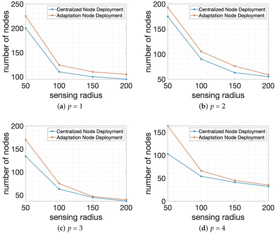 For the second set of simulations, we also executed two algorithms, Algorithm 1: Centralized Node Deployment and Algorithm 2: Adaptation Node Deployment, using various sensing radii with the allowed number of connections through the wall t = 20 and q = 50 in smart building size, as can be seen in Figure 8. Similar to the first group of experiments, the experimental outcome results consist of two axes, where the X-coordinate represents the sensing radius of system members and the Y-coordinate specifies the total number of system members as the final outcome. In Figure 8, sensing radius or detection range has been set as 50, 100, 150, or 200. Figure 8a,b shows the performance comparison if two algorithms are executed with p = 1 and p = 2. And Figure 8c,d stands for the performance of two algorithms when p = 3 and p = 4 are utilized in the system. According to Figure 8, it is observed that the total number of system members is decreasing significantly as the sensing range of the node is increasing. The reason is that the larger sensing range gives more opportunity to search for neighbors or system members when the wall-recognition surveillance security barriers are formed. Moreover, it is demonstrated that Algorithm 2: Adaptation Node Deployment outperforms Algorithm 1: Centralized Node Deployment for all applicable missions in the second scenario of simulation. And the performance difference between two algorithms is diminished if the sensing range of system members increases.