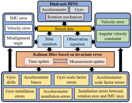 In addition to the traditional IMU error, this article considers the installation error of the gimbal mechanism and stores the gyro, accelerometer, and gimbal mechanism signals outputs in real time. In order to quickly and accurately estimate the error parameters, the navigation parameters are established in the form of invariant errors, the linear Kalman filter is used to accurately estimate the calibration errors, and the stored data is reused through the backtracking algorithm to shorten the filter convergence time. Finally, a fast, autonomous, and accurate dual-axis rotation inertial navigation system-level self-calibration algorithm is achieved. The structure of the Kalman filter based on the invariant error during self-calibration is shown in Figure 1.
