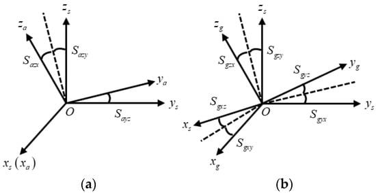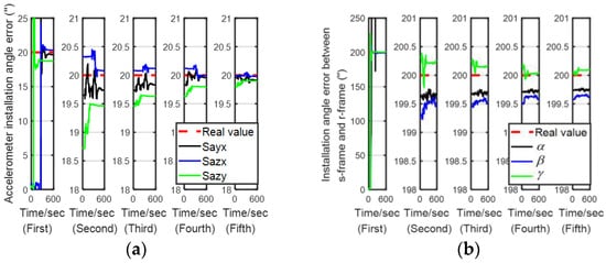 Estimation of accelerometer installation angle errors. (a) , , ; estimation of installation angle errors between the s-frame and r-frame. (b) , , and .