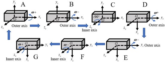In order to accurately estimate all the state variables in the self-calibration procedure, the rotation scheme should be properly designed to ensure that all the state variables are observable. Reference [] proposed design principles for a rotation scheme, which included pointing upward and downward alternately for each accelerometer and a bidirectional rotation on each gyro. According to the above principles and the limitations of the gimbal mechanism, the rotation scheme proposed in this article is shown in Figure 4. In a rotation period, first, the outer axis rotates 270 degrees and −270 degrees (corresponding to A and B in Figure 4). Then, the inner axis rotates to −90 degrees (corresponding to C in Figure 4), and the outer axis rotates bidirectionally (corresponding to D and E in Figure 4). Finally, the inner axis rotates bidirectionally (corresponding to F and G in Figure 4) and returns to position A. During the rotation, the angular velocity is , and it stops for seconds after each rotation of 90 degrees. According to Equation (16), except for and , the remaining calibration errors require and to excite. In order to excite the error of the gyros, the gyros should be continuously sensitive to the angular velocity of the gimbal mechanism. In the same way, to excite the error of the accelerometers, the accelerometer should be in the vertical direction of the horizontal plane for a long time. Therefore, in order to fully excite the IMU error, is set to 18°/s and the stop time is set to 30 s. The complete rotation period is 600 s.