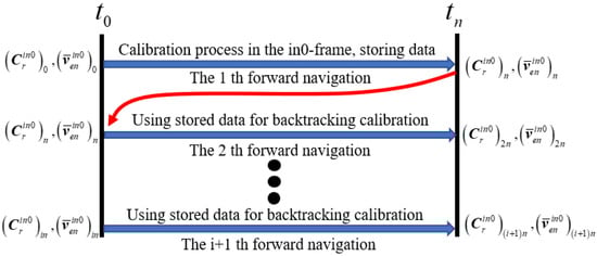 Backtracking navigation reduces the calibration time by utilizing stored data multiple times. The backtracking scheme is shown in Figure 5. During the calibration process, the SINS update algorithm in the inertial frame is applied for forward navigation. During the first forward navigation process, the data of the IMU and gimbal mechanism are stored. Subsequently, using the stored data multiple times, the calibration parameter error can be accurately estimated in a short time.