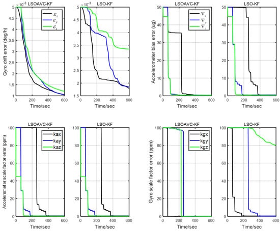 The observability was assessed with a covariance analysis. The convergence process of the root mean square (RMS) of the calibration error covariance is shown in Figure 6. It can be seen from Figure 6 that the RMSs of the , , , , and error covariance are large. The observability is consistent with the analysis in Section 4. After introducing AVC constraints into the measurement equation, all the calibration error parameters could be estimated well. Moreover, the RMS of the error covariance became smaller faster.