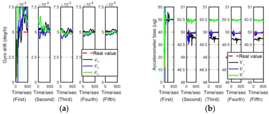 Figure 7, Figure 8, Figure 9 and Figure 10 describe the estimation results of the calibration errors; the red dotted lines represent real values, and the solid lines represent the estimation result of the proposed method (LSEAVC-KF). It took 600 s in the first stage, and then the time spent on backtracking navigation was calculated using the Matlab platform to be 106.1 s. We can see all errors present good convergence with the proposed method within 12 min. Except for the gyro drift error, the rest of the calibration errors converged to near the true value in the first stage. The estimation error of the gyro drift was less than 4%, and the rest of the calibration errors were less than 2%.