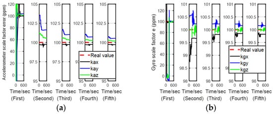Estimation of IMU-scale factor errors. (a) , , ; (b) , , .