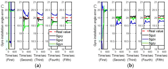 Estimation of gyro installation angle errors. (a) , , (b) , , .