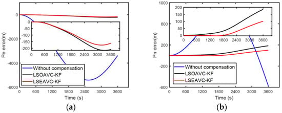 The statistical results of the navigation errors are listed in Table 6. In Table 6, Ve and Vn denote the east and north velocities, respectively, in the navigation frame. Pe and Pn denote the east and north positions, respectively, in the navigation frame. It can be seen in Table 6 and in Figure 12 and Figure 13 that the navigation performance of the inertial navigation system was improved with LSEAVC-KF. The maximum error and root mean square error of LSEAVC-KF are smaller than those of LSOAVC-KF.
