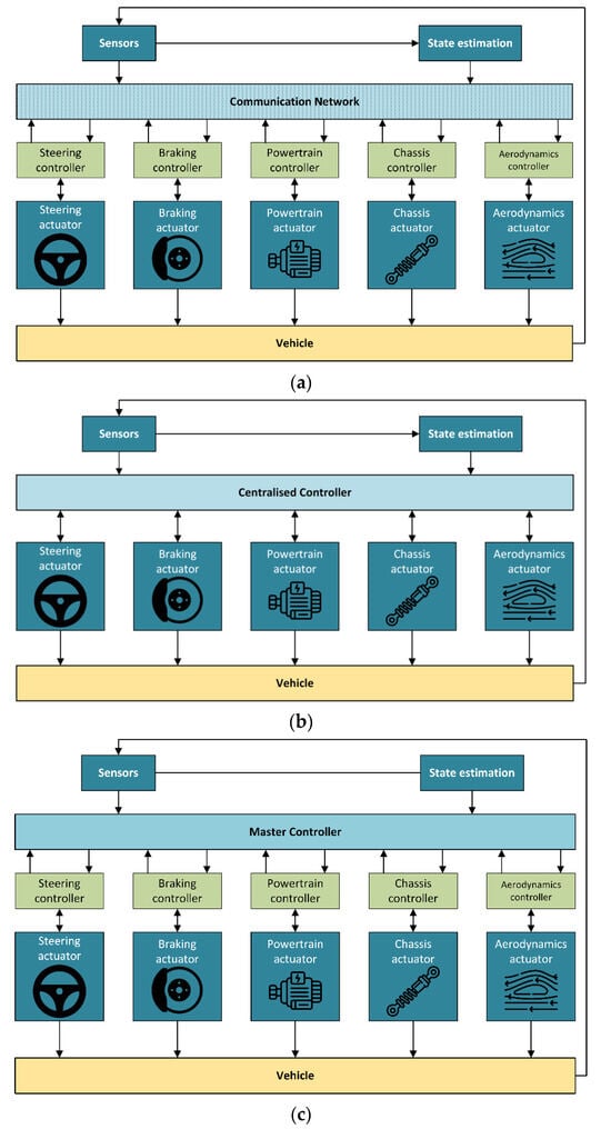 Simplified integrated chassis control structures: (a) decentralised, (b) centralised, and (c) coordinated.